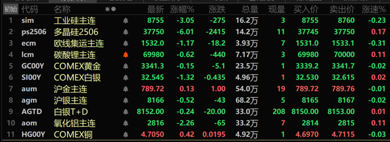 此外,氧化铝跌2.26%。碳酸锂跌0.62%,工业硅跌3.05%,多晶硅跌6.01%。