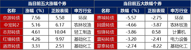 【转债市场主要指数集体收涨】 4月17日,转债市场跟随权益市场有所反弹,当日中证转债、上证转债、深证转债分别收涨0.19%、0.19%、0.18%。当日,转债市场成交额477.11亿元,较前一交易日缩量54.36亿元。转债市场大多个券上涨,481支转债中,324支收涨,141支下跌,16支持平。当日上涨个券中,京源转债涨超7%,中宠转2涨超5%;下跌个券中,惠城转债跌逾5%,回盛转债跌逾4%。