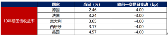 4月17日,主要欧洲经济体10年期国债收益率普遍下行。其中,德国10年期国债收益率下行4bp至2.46%,法国、意大利、西班牙、英国10年期国债收益率分别下行3bp、4bp、4bp和4bp。