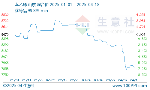 据生意社商品分析系统,18日,苯乙烯市场价格小幅下跌。综合来看,近期苯乙烯市场持续弱势,前期更是宽幅下跌,近几天因纯苯行情略有回暖,价格稍有抬头。4月苯乙烯集中检修较多,供应端维持收紧,下游3S工厂库存偏高,开工受限。受关税政策的不确定影响,原料纯苯行情不明朗,密切关注后市原料和市场供需变化。