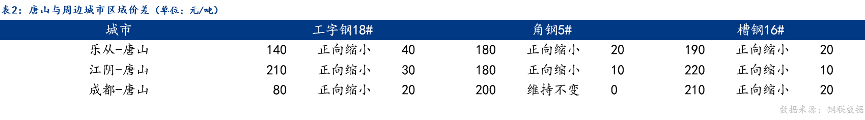 从区域价差来看,今日唐山与乐从、江阴工字钢、角钢、槽钢价差正向缩小;与成都工字钢、槽钢价差正向缩小,与角钢价差维持不变;
