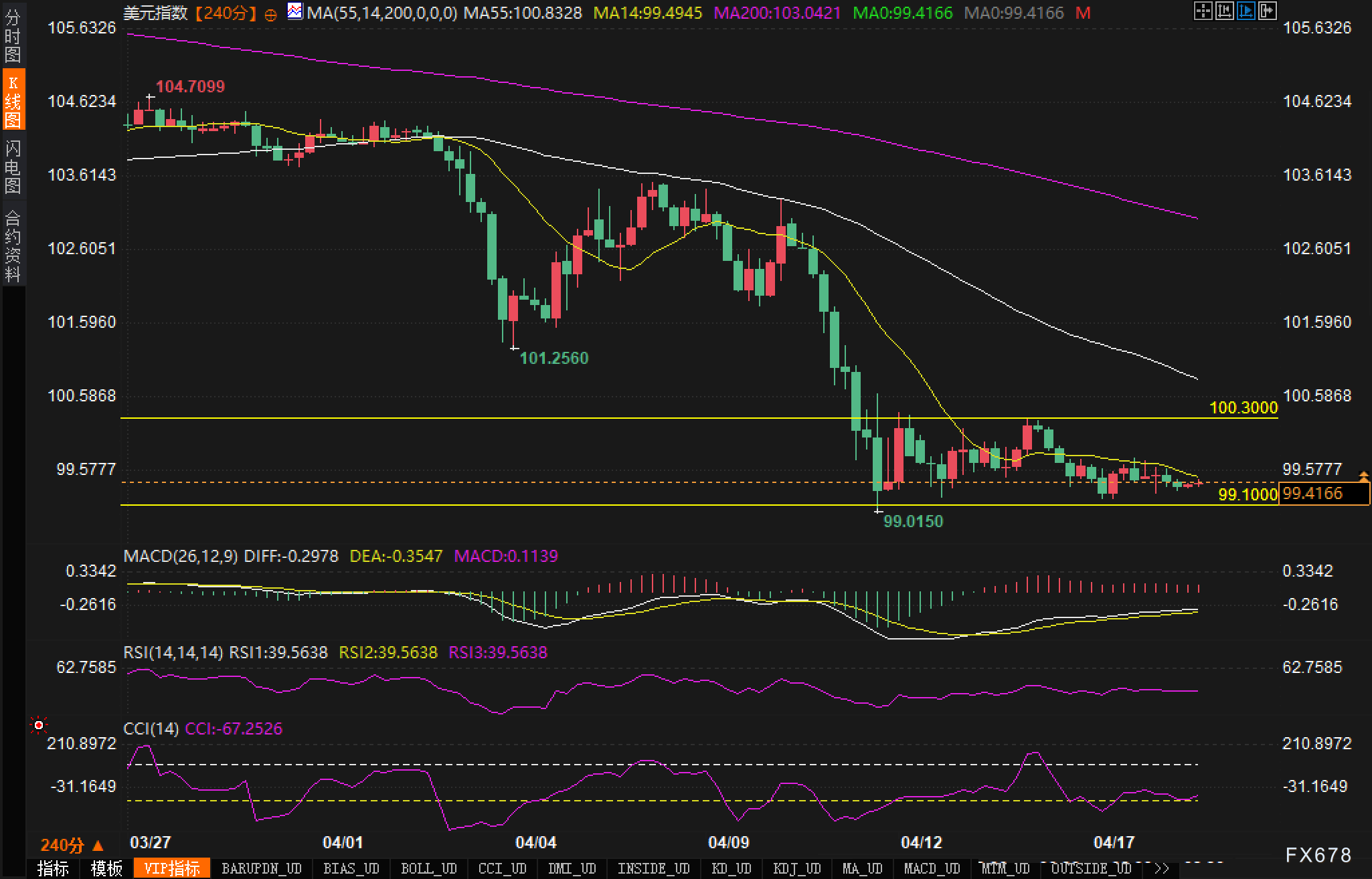 汇通财经APP讯——周五(4月18日)欧洲时段,美元指数持续在99.50下方盘整,市场关注美联储降息预期与关税政策影响的角力。技术图表显示关键支撑位已告失守,短期下行风险明显增加。