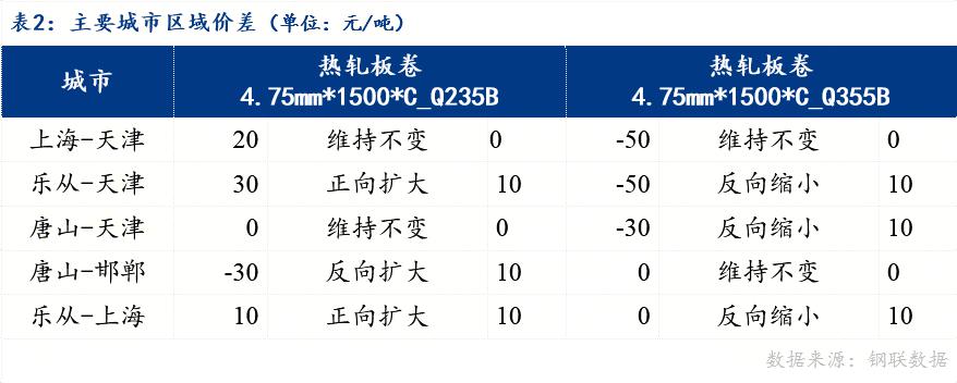 从区域价差来看,4.75mm普卷华南与华北价差30元/吨,华东与华北价差20元/吨,华南与华东价差10元/吨。京津冀地区价差来看,唐山与天津价差0元/吨,唐山与邯郸价差-30元/吨。