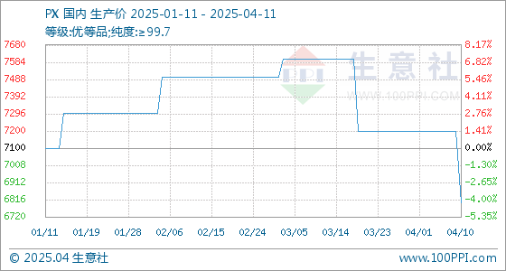 4月11日,生意社PX基准价为6800.00元/吨,与本月初(7200.00元/吨)相比,下降了-5.56%。