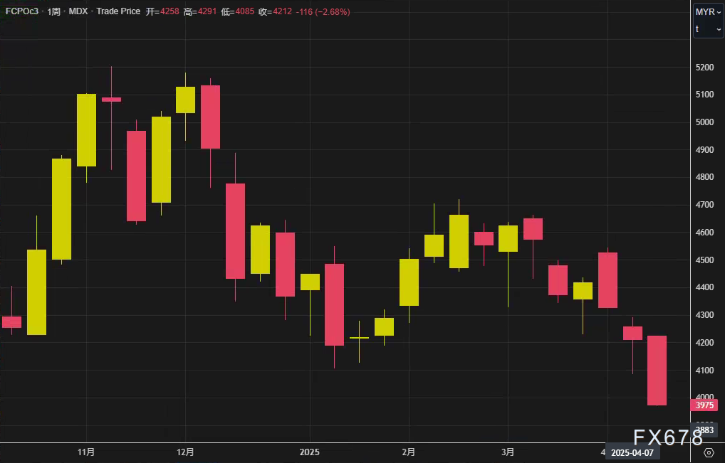 汇通财经APP讯——周五(4月18日),马来西亚衍生品交易所(BMD)棕榈油主力合约延续颓势,7月合约收报3975林吉特/吨,单日下跌0.9%,周线累计跌幅达5.63%,创近28周最低水平。尽管盘中一度试图反弹,但大连豆油及棕榈油期货的疲软表现拖累市场情绪,最终价格回落至4000林吉特关键心理关口下方。