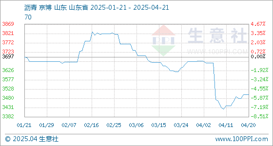 4月21日,生意社沥青基准价为3500.00元/吨,与本月初(3675.20元/吨)相比,下降了-4.77%。