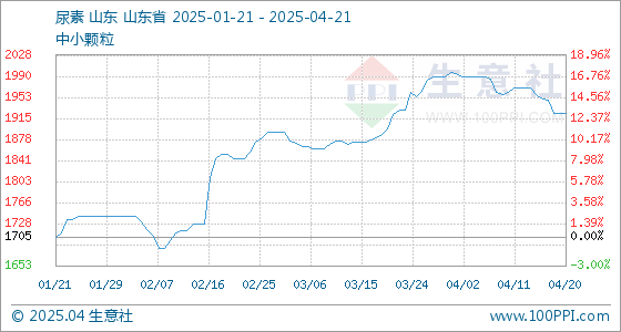 4月21日,生意社尿素基准价为1924.00元/吨,与本月初(1997.00元/吨)相比,下降了-3.66%。