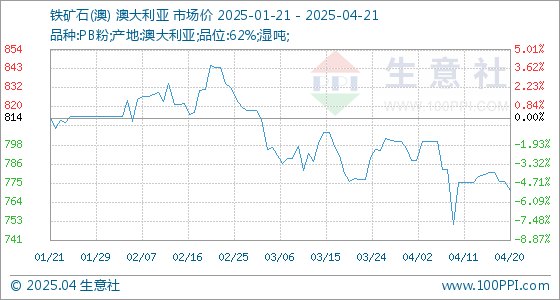 4月21日生意社铁矿石(澳)基准价为771.11元/吨