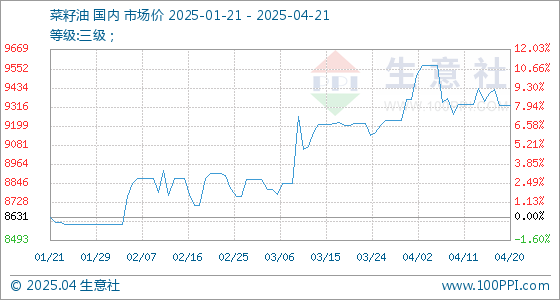 4月21日生意社菜籽油基准价为9325.00元/吨