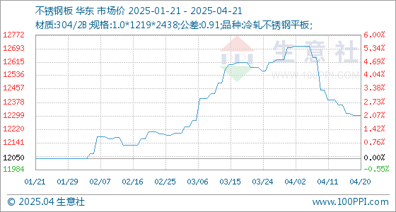 4月21日,生意社不锈钢板基准价为12300.00元/吨,与本月初(12700.00元/吨)相比,下降了-3.15%。