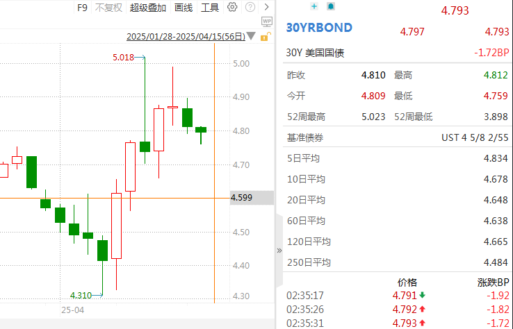 不过,随着近期美股、美元指数逐渐企稳,美债市场也企稳反弹。10年期美债收益率目前已下行至4.366%,30年期美债收益率下行至4.793%。