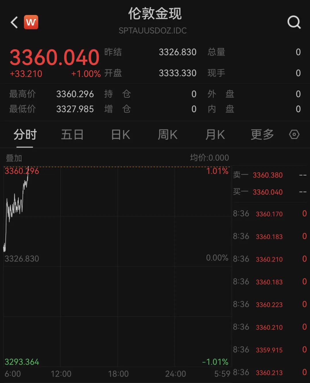 现货黄金早盘持续拉升,突破前高并将历史高位刷新至3360.296美元/盎司,日内累涨超33美元,涨幅扩大至1%。