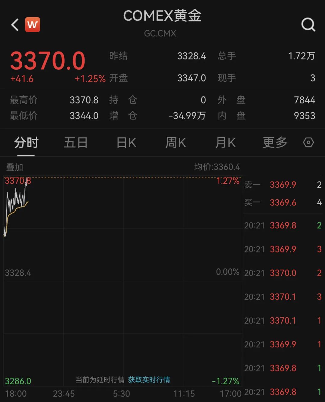 COMEX黄金亦持续拉升,截至发稿,涨超1%。