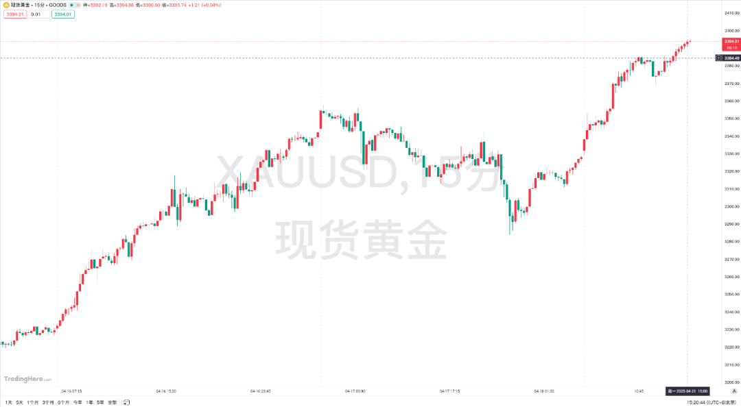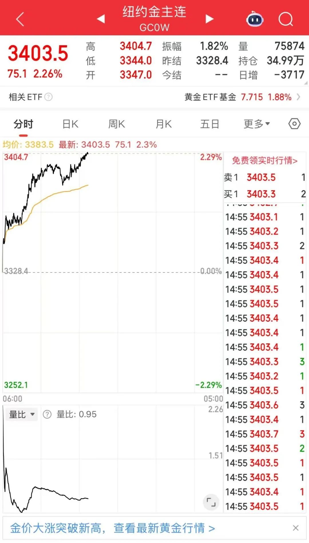 商品方面,今日国际金价再创新高。截至发稿,现货黄金突破3395美元/盎司,逼近3400美元/盎司大关,日内涨超1.8%。纽约期金突破3400美元/盎司大关,日内涨超2%。