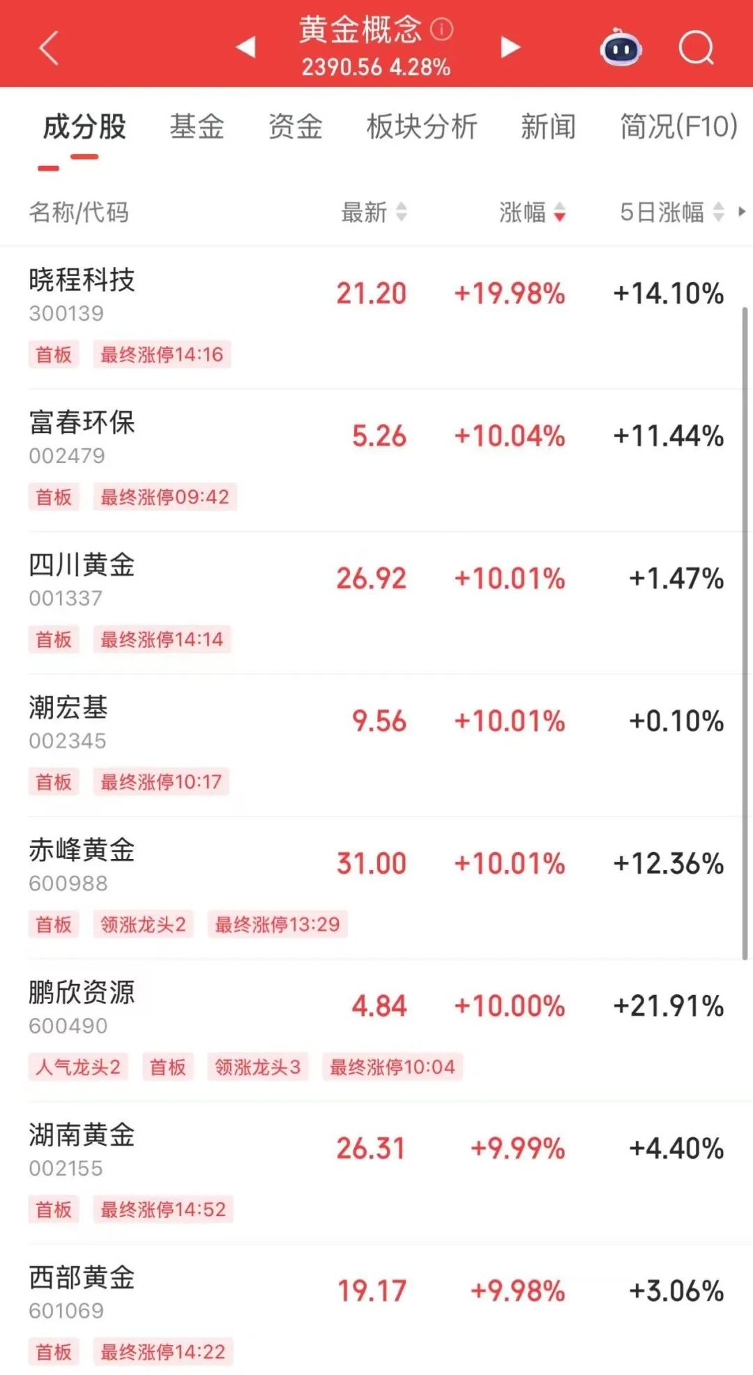 A股黄金概念股全天表现强势,晓程科技、富春环保、赤峰黄金、四川黄金等股涨停。