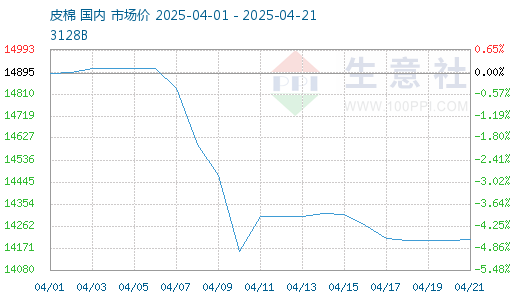 上周宏观面无利好信号释放,基本面依旧偏弱,市场情绪谨慎,行情小幅震荡。据生意社商品行情分析系统,截至4月21日3128B级皮棉现货价格在14207元/吨,较月初下跌4.62%。