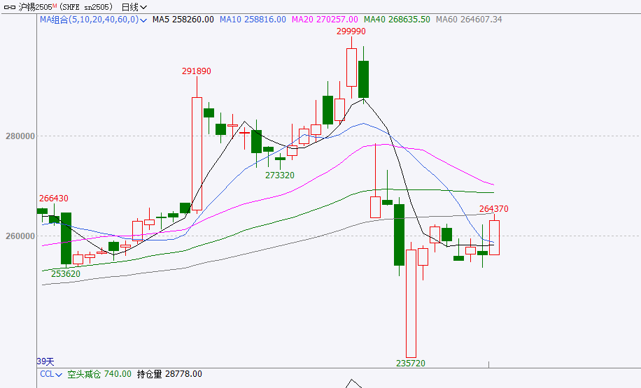 4月21日沪锡主力2505合约震荡走高,盘中涨幅近3%,截止下午收盘报263140,涨幅2.5%。