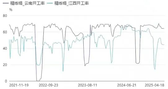刚果(金)锡矿虽复产,但缅甸锡矿复产推迟,国内锡矿供应仍偏紧,3月我国锡矿进口量维持低位,锡矿加工费继续下调,原料紧缺下,云南与江西两省精炼锡冶炼企业开工率保持在较低水平,合计开工率为56.96%。