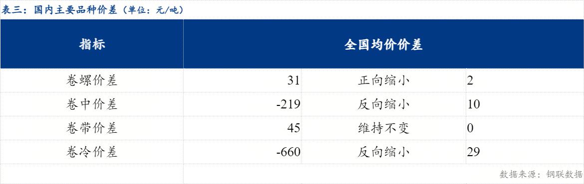 从品种价差来看,卷螺差较上一交易日正向缩小2元/吨 ,热中价差较上一交易日反向缩小10元/吨,热带价差较上一交易日维持不变,热冷价差较上一交易日反向缩小29元/吨 。