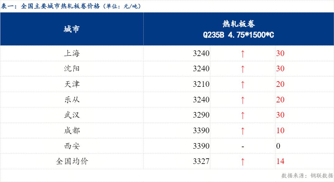 截止发稿时4.75热轧板卷全国均价3327元/吨,较上一交易日上涨14元/吨。其中主要城市价格为上海3240元/吨,沈阳3240元/吨,天津3210元/吨,乐从3240元/吨,武汉3290元/吨,成都3390元/吨,西安3390元/吨。