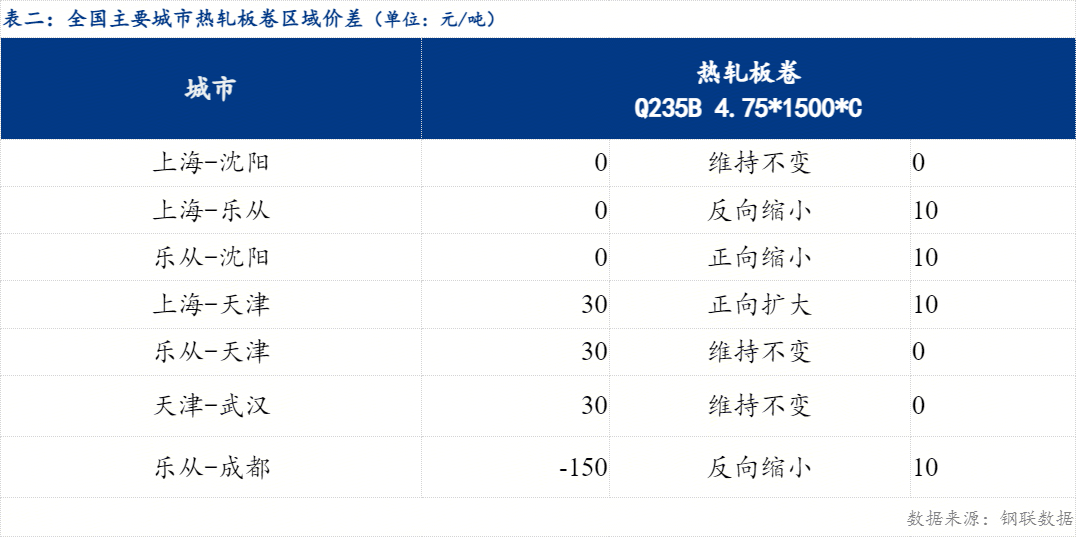 从区域价差来看,华东与东北价差0元/吨,较上一交易日维持不变;华东与华南价差0元/吨,较上一交易日反向缩小10元/吨;华南与华北价差为30元/吨,较上一交易日维持不变 。