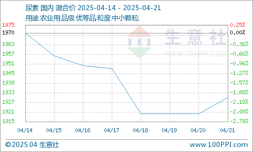 据生意社商品行情分析系统,截止4月21日,国内尿素市场参考均价为1913元/吨,较4月14日市场参考均价1970元/吨,国内尿素市场价格下跌幅度为2.88%。