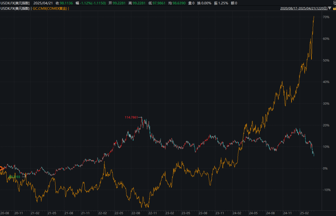 周一,美元指数(DXY)暴跌超过1%,一度跌破整数关口98,为2022年3月以来最低点。当天,黄金历史上首次正式突破3400美元/盎司。