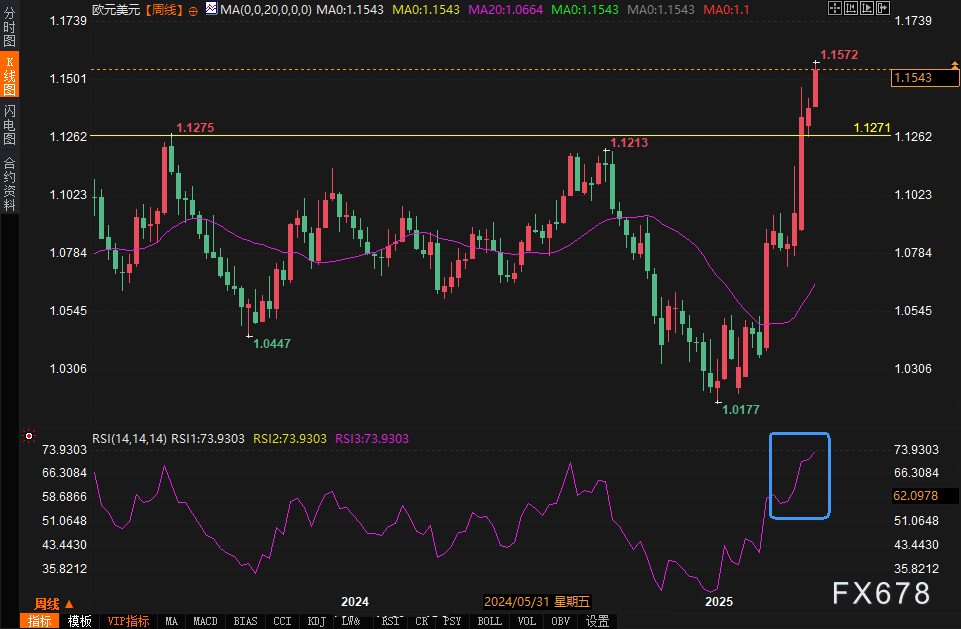 趋势指标:20周指数移动平均线(EMA)目前位于1.0850附近,持续上行,表明长期趋势仍偏多头。这一水平距离当前价位较远,显示市场暂无明显回调压力。