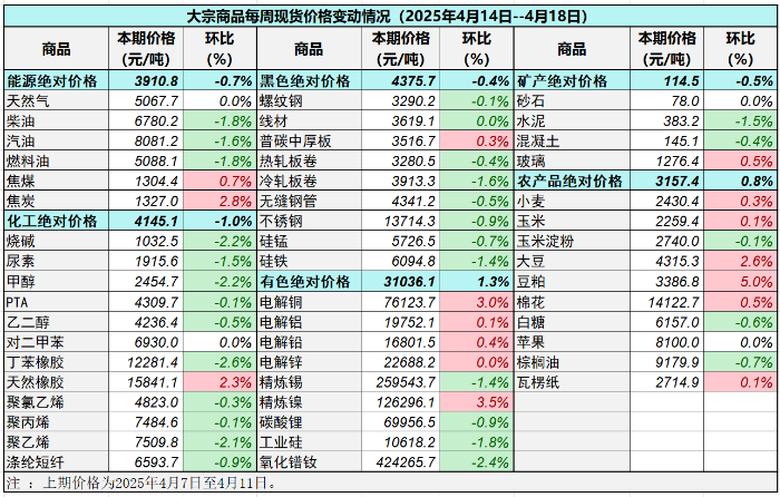 本表所示大宗商品价格(类别与产品规格说明见附表)为以人民币计价的现货价格(包含流通费用、利润和税费等)。计算这些价格时使用的信息来源,主要包括国内重点地区的生产商、贸易商及下游消费企业之间的成交、询报盘及可成交价格。价格单位为人民币元/吨。