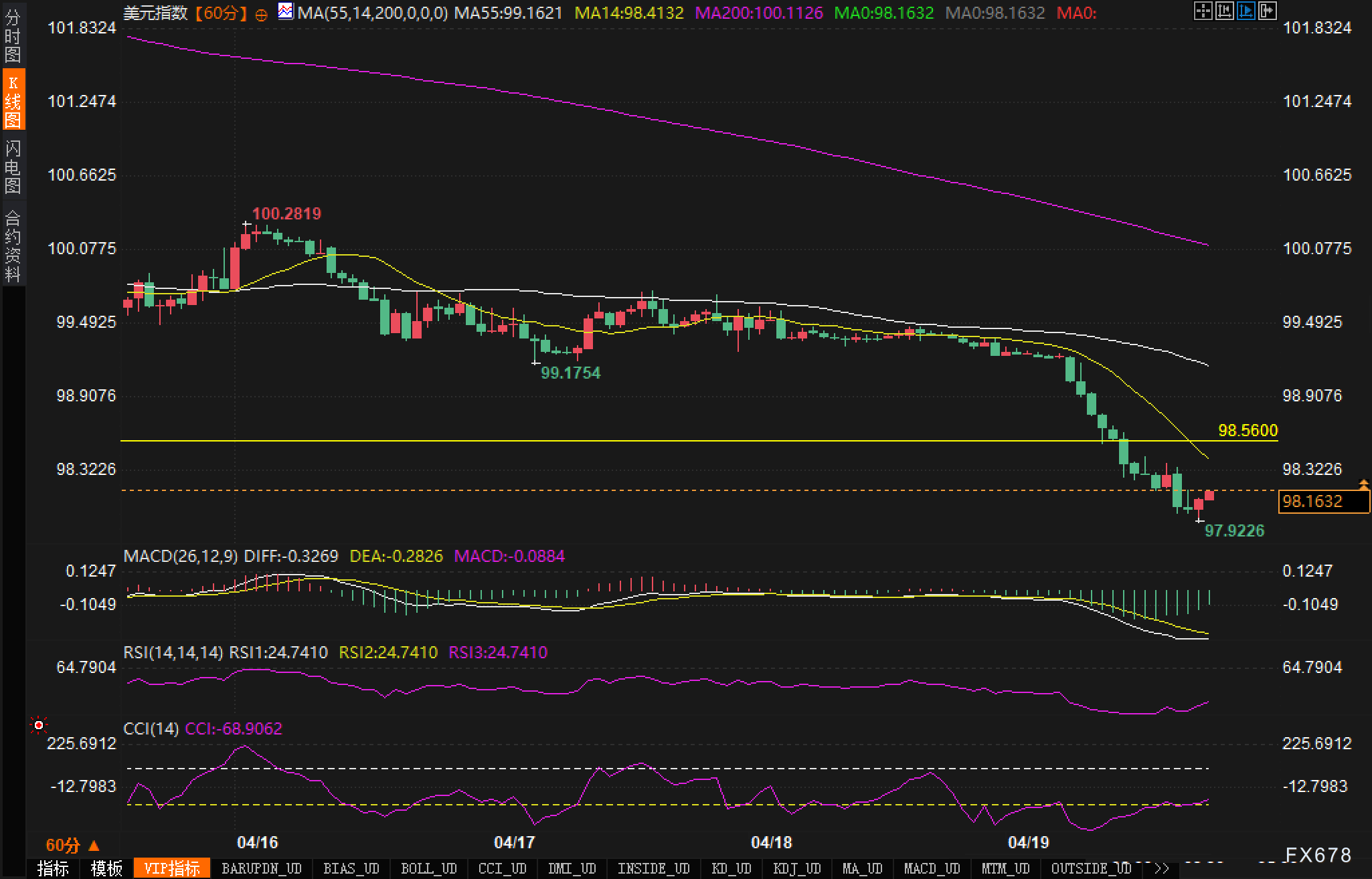 60分钟图显示,美元指数跌破98.5600关键支撑位后,进一步下探至97.9226,随后小幅反弹。MACD指标显示死叉形态持续扩大,DIFF为-0.3269,DEA为-0.2826,柱状体继续处于零轴下方,显示短期下行动能强劲。RSI指标位于24.7410,处于超卖区域,但尚未出现明显背离信号。
