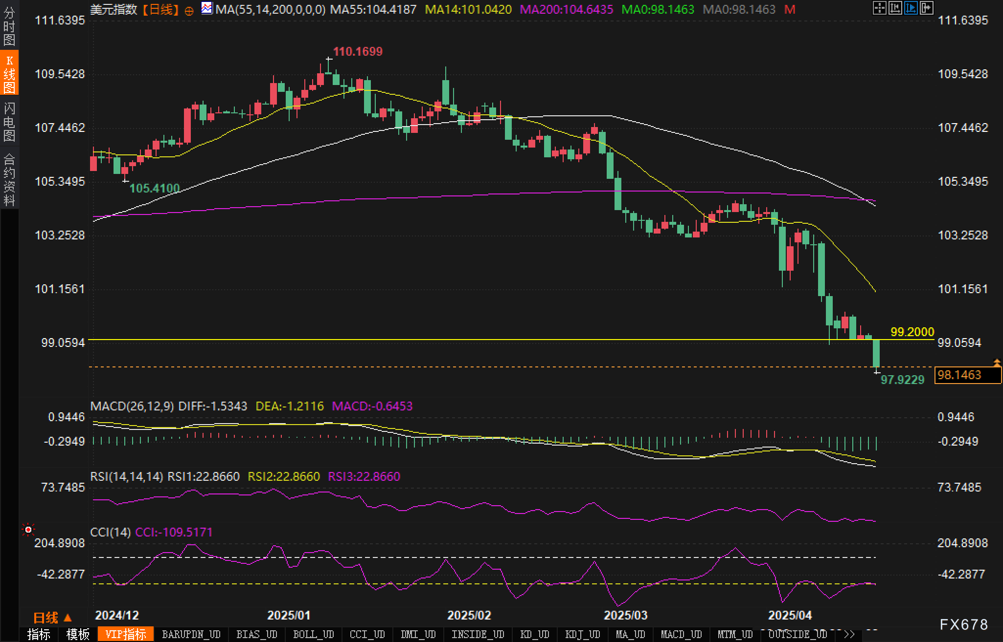 日线图展现出更为清晰的下跌趋势。美元指数从110.1699高点一路下跌,中间虽有小幅反弹,但整体呈现明显的下降通道。价格已跌破99.2000重要心理支撑位至97.9229,随后小幅反弹。日线MACD指标DIFF为-1.5343,DEA为-1.2116,柱状体继续扩大,显示中期下行趋势强劲。RSI指标位于22.8660的超卖区域,CCI指标为-109.5171,同样处于超卖状态,暗示可能出现技术性反弹,但反弹力度可能有限。
