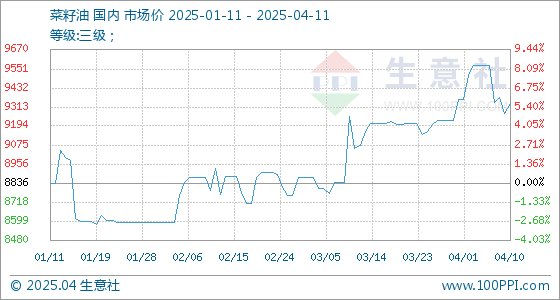 4月11日生意社菜籽油基准价为9333.33元/吨