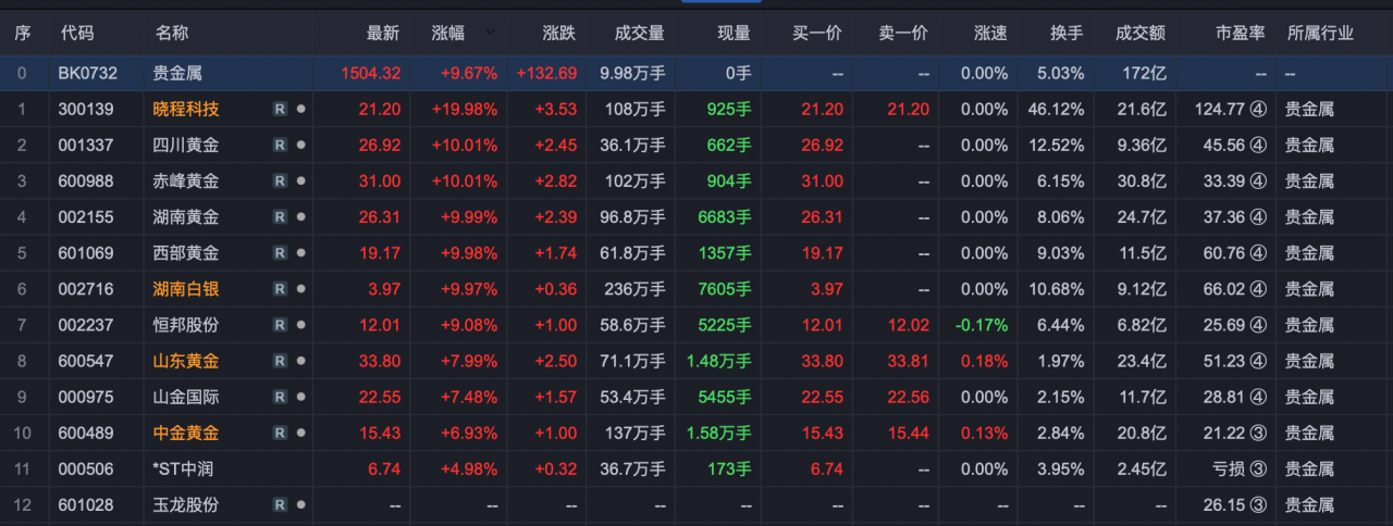 截至4月21日收盘,贵金属板块以9.67%的涨幅领涨全市。板块中,除中金黄金(600489)、山金国际(000975)、山东黄金(600547)涨幅不到10%及玉龙股份(601028)停牌外,其余个股全都涨停。