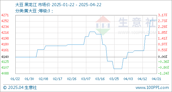 4月22日,生意社大豆基准价为4256.00元/吨,与本月初(4136.00元/吨)相比,上涨了2.90%。