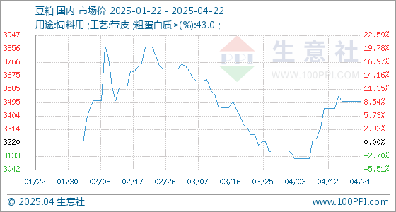 4月22日,生意社豆粕基准价为3502.00元/吨,与本月初(3168.00元/吨)相比,上涨了10.54%。