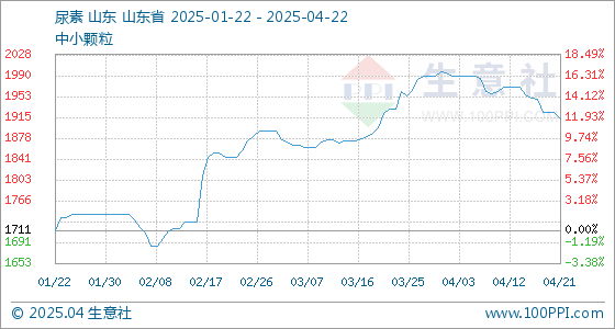 4月22日,生意社尿素基准价为1913.33元/吨,与本月初(1997.00元/吨)相比,下降了-4.19%。