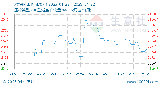 4月22日,生意社菜籽粕基准价为2545.00元/吨,与本月初(2616.67元/吨)相比,下降了-2.74%。