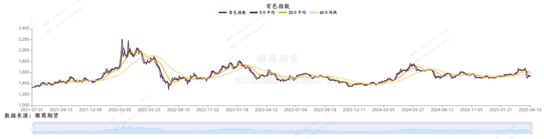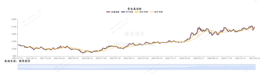 贵金属指数上涨1.13%。在宏观和避险情绪支撑下,贵金属价格继续走高,其中黄金不断创历文新高,COEK黄金突破30美元,最高触及3371.9美元/盎司:白银则受工业属性的影响,在科技股大幅下挫的背景下,白银表现不及黄金,金银比价维持在10附近,处于历史较高水平。美国关税政策反复,在避险属性支撑下,贵全属或高位震荡偏强,不排除黄金再创新高的可能。随着市场不断消化关税预期,贵金属的避险和抗通胀属性或将再度受投资者青睐。中期来看,市场交易的逻辑或在经济表现以及各项政策落地情况,若经济持续表现超预期,降息预期或进一步调整,贵金属中期或宽幅震荡为主。长期而言,抗通胀和避险需求将继续支撑贵金属价格,在通胀预期反弹、货币政策宽松和大财政政策支撑下,贵金属仍具有上涨空间。