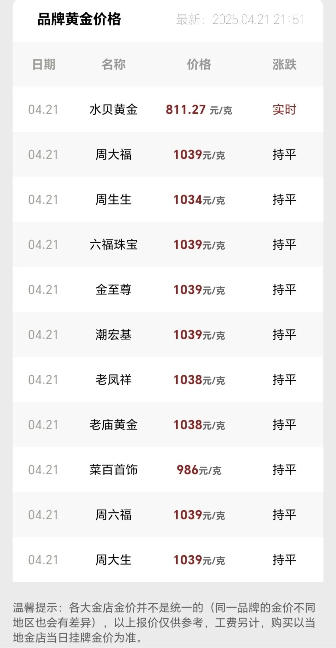 国内市场方面,4月21日晚间,上海期货交易所黄金期货主力合约(AU2506)价格突破810元/克关口,续创历史新高。跟随金价狂飙的还有国内黄金饰品价格。《金融时报》记者查询发现,国内品牌金饰价格普遍已经超过1000元/克。