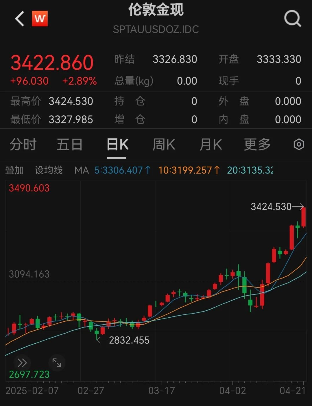 4月21日,黄金热继续席卷全球。当日晚间,现货黄金再创历史新高,伦敦现货黄金升破3400美元/盎司关口,年初至今已累计涨近30%。过去17周里,伦敦现货黄金只有2周价格下跌,15周价格上涨。4月21日晚,COMEX黄金期货价格涨超3%,也站上了3400美元/盎司的高位。
