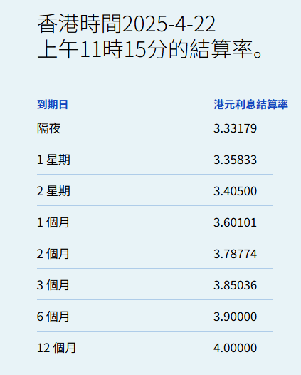 复活节后港元中短期拆息上升隔夜息微升至3.3318%