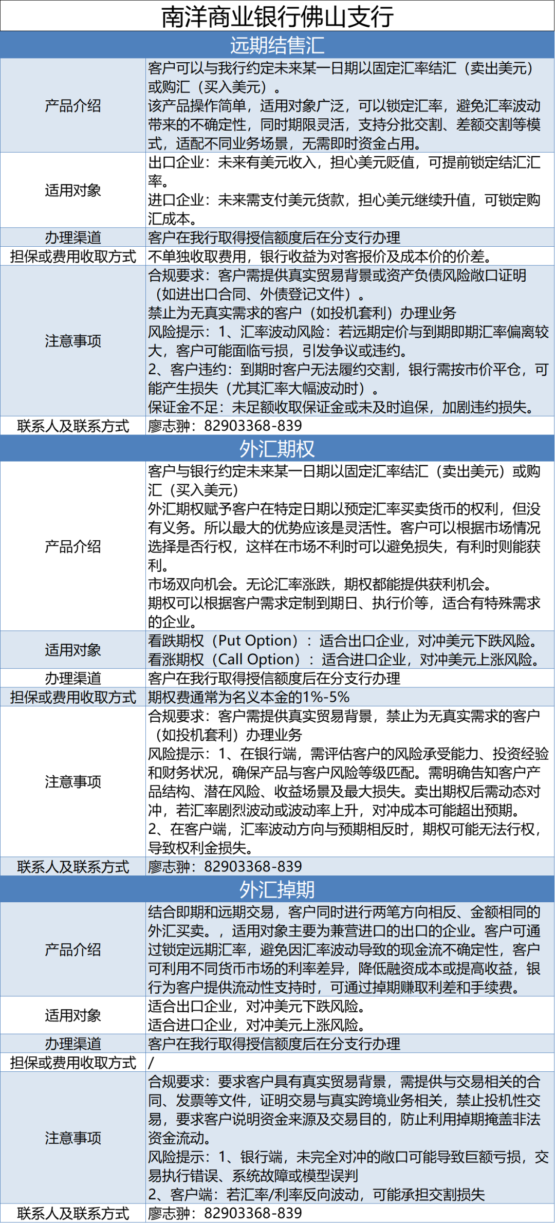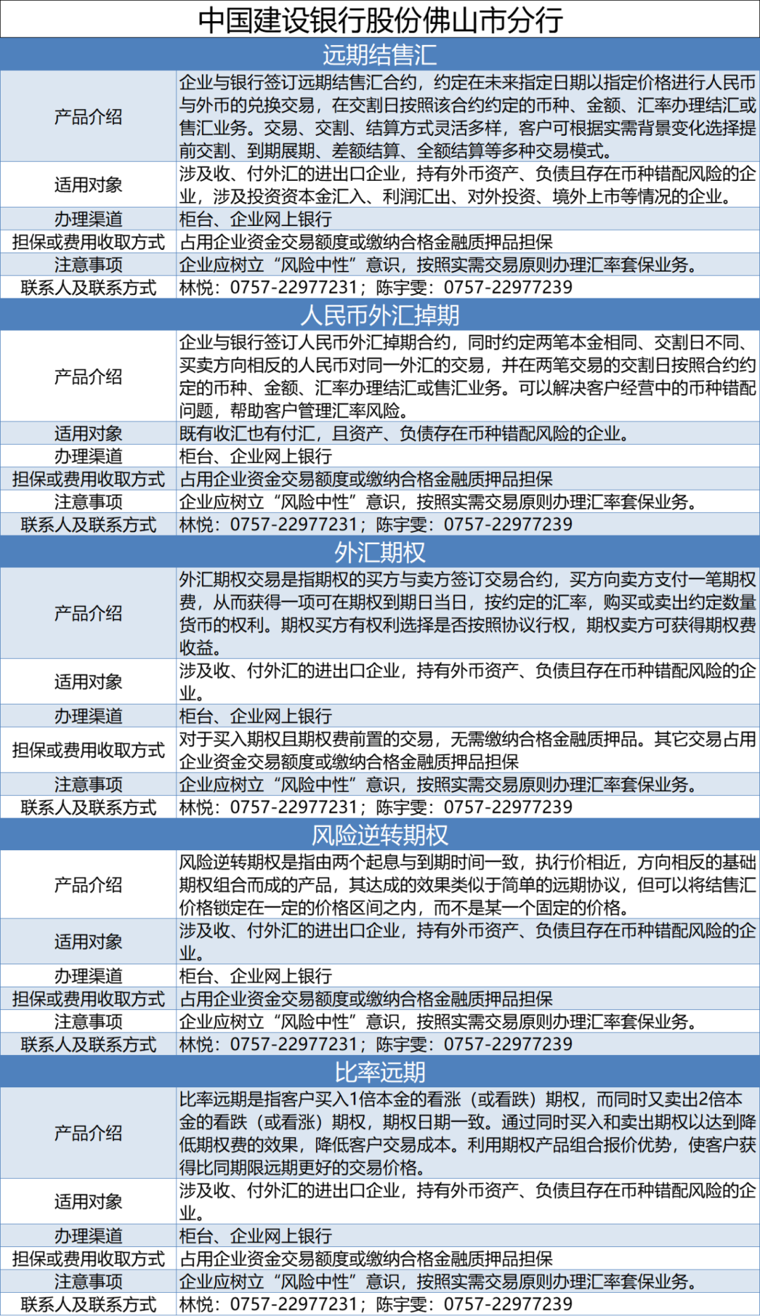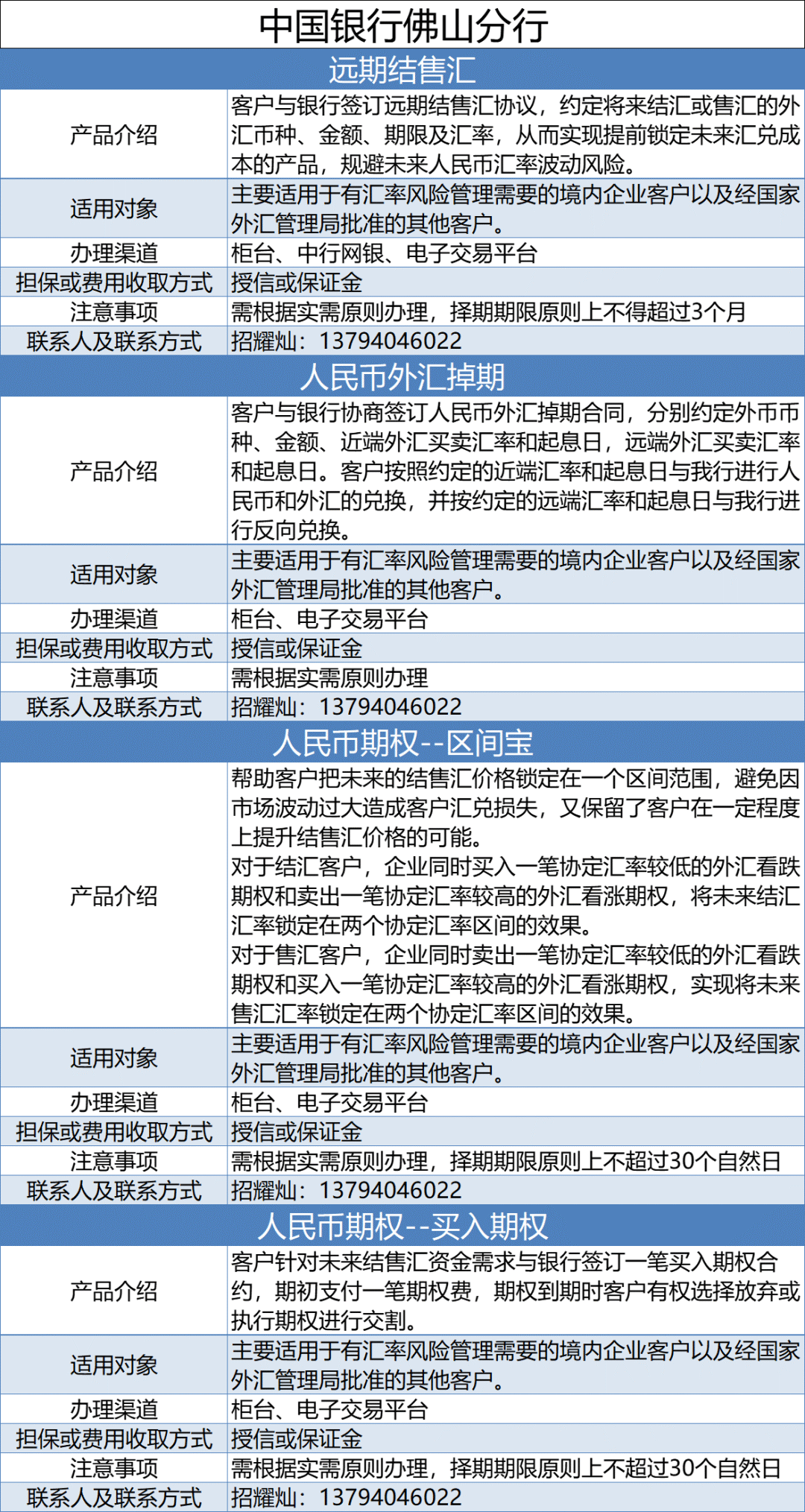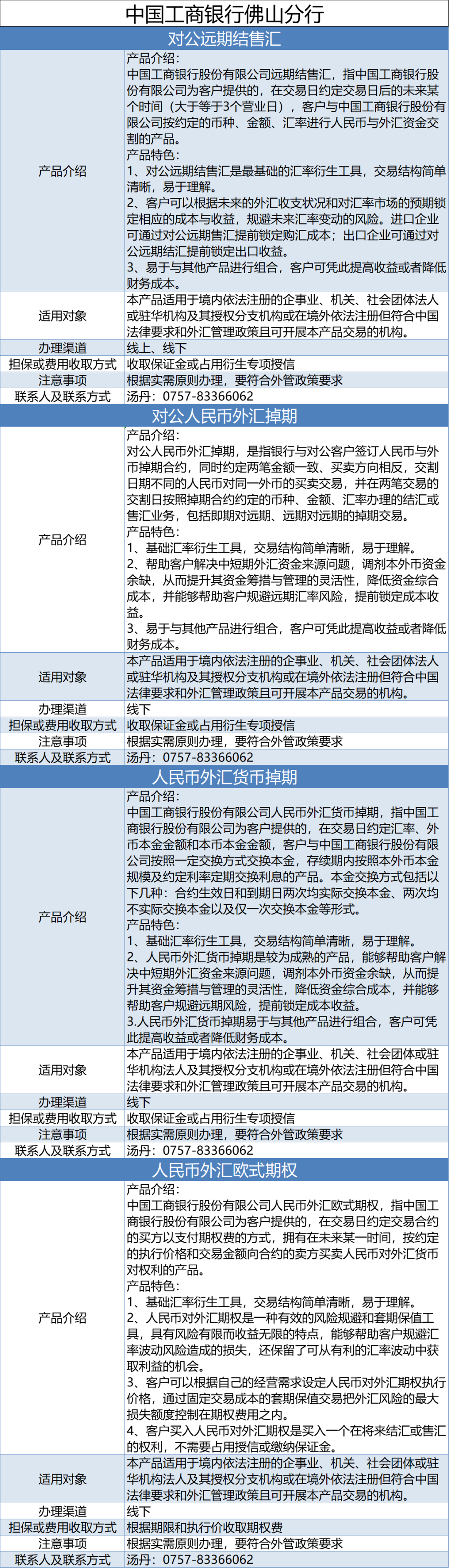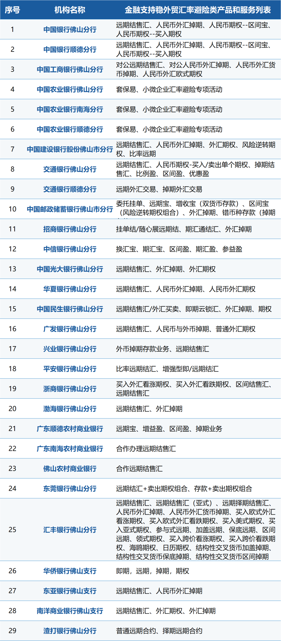 为贯彻落实党中央、国务院稳外贸工作决策部署,进一步加大对各类外贸主体的金融支持,优化融资、结算、外汇等金融服务,中国人民银行佛山市分行、国家外汇管理局佛山市分局积极引导辖内银行业金融机构创新服务产品,整理形成融资、结算、外汇等系列金融支持稳外贸产品和服务汇编,现予发布第二期——汇率避险产品,有汇率风险管理需求的市场经营主体可向相关金融机构咨询办理。