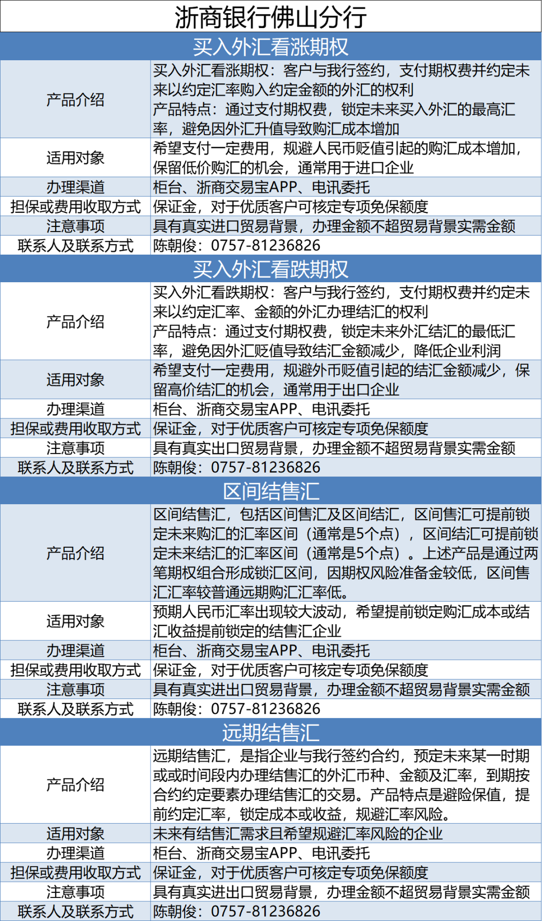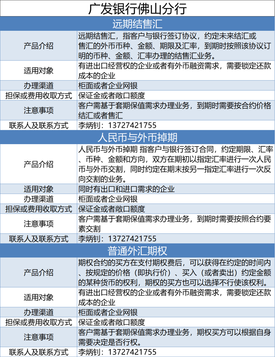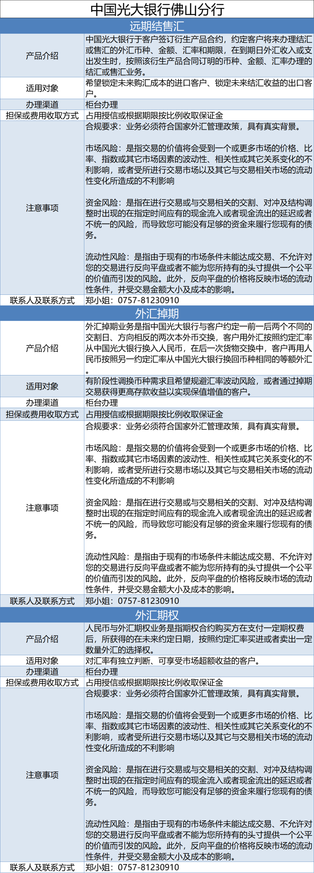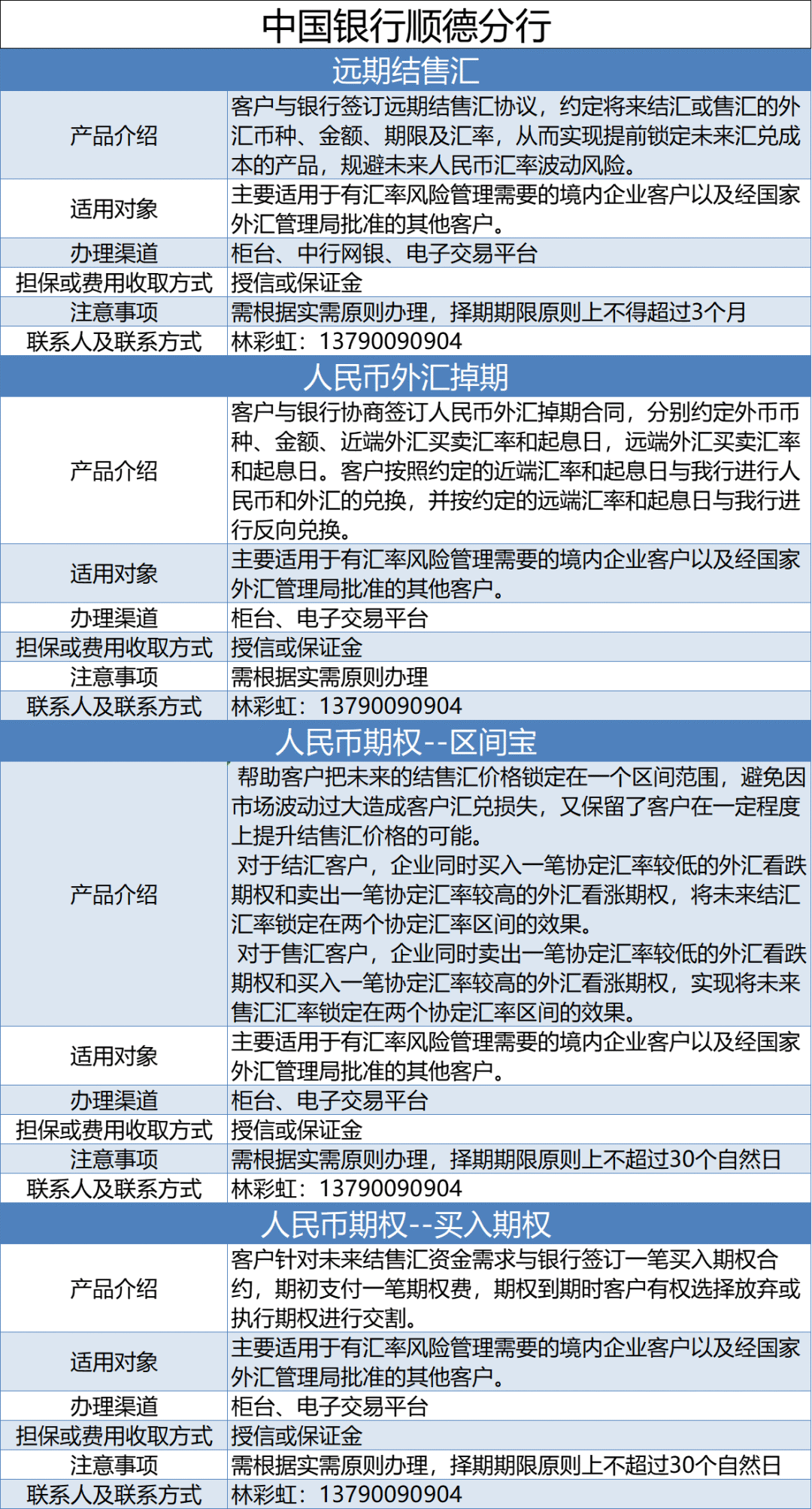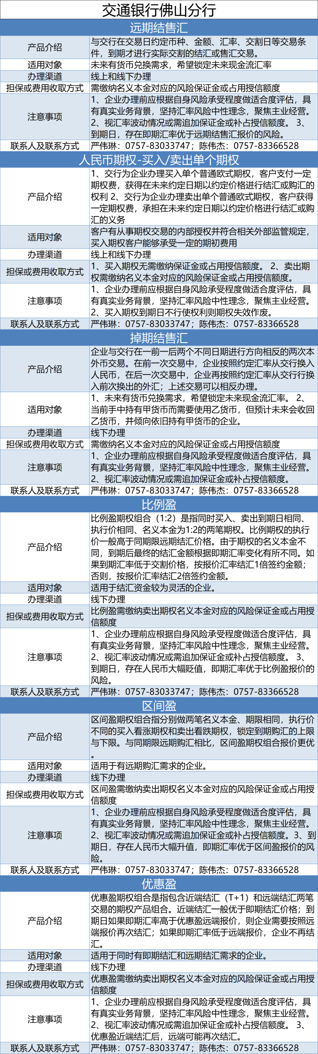 为贯彻落实党中央、国务院稳外贸工作决策部署,进一步加大对各类外贸主体的金融支持,优化融资、结算、外汇等金融服务,中国人民银行佛山市分行、国家外汇管理局佛山市分局积极引导辖内银行业金融机构创新服务产品,整理形成融资、结算、外汇等系列金融支持稳外贸产品和服务汇编,现予发布第二期——汇率避险产品,有汇率风险管理需求的市场经营主体可向相关金融机构咨询办理。