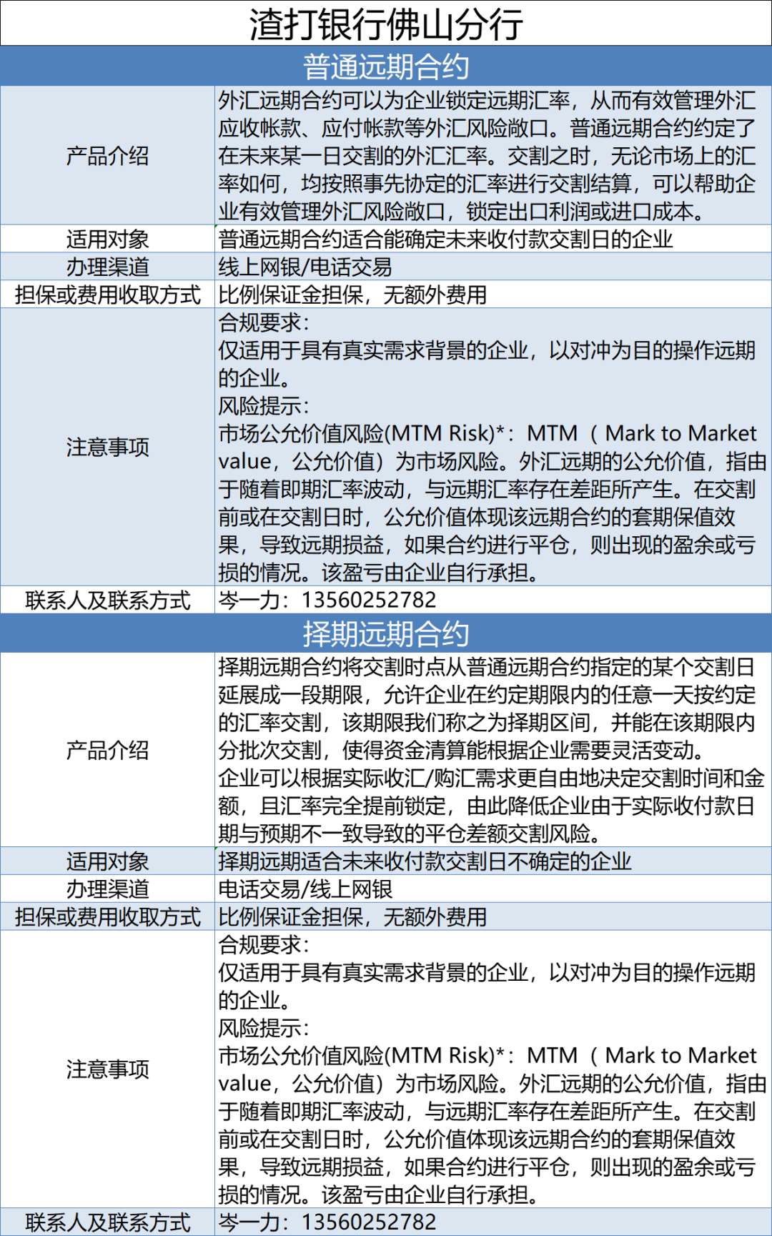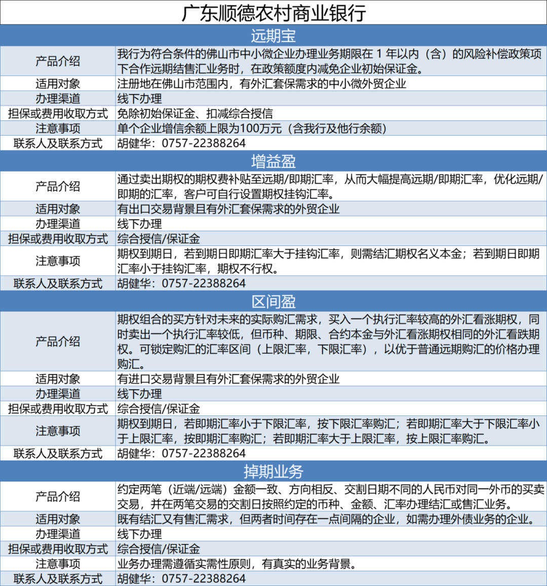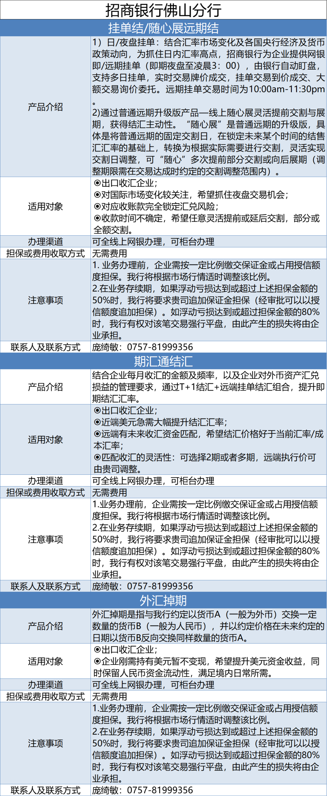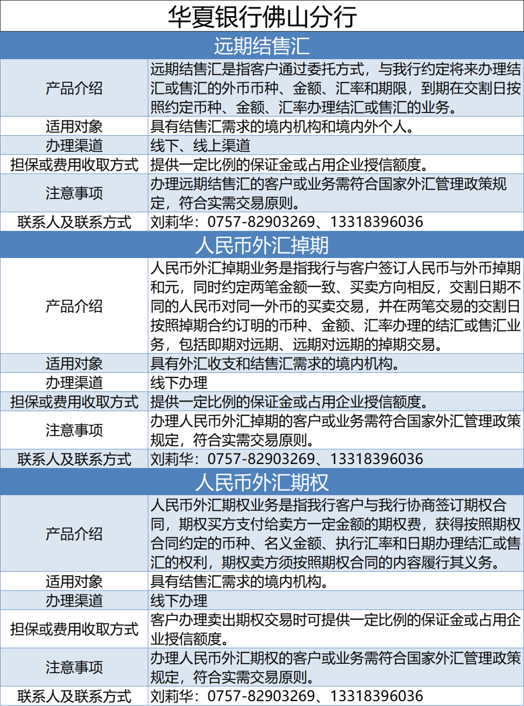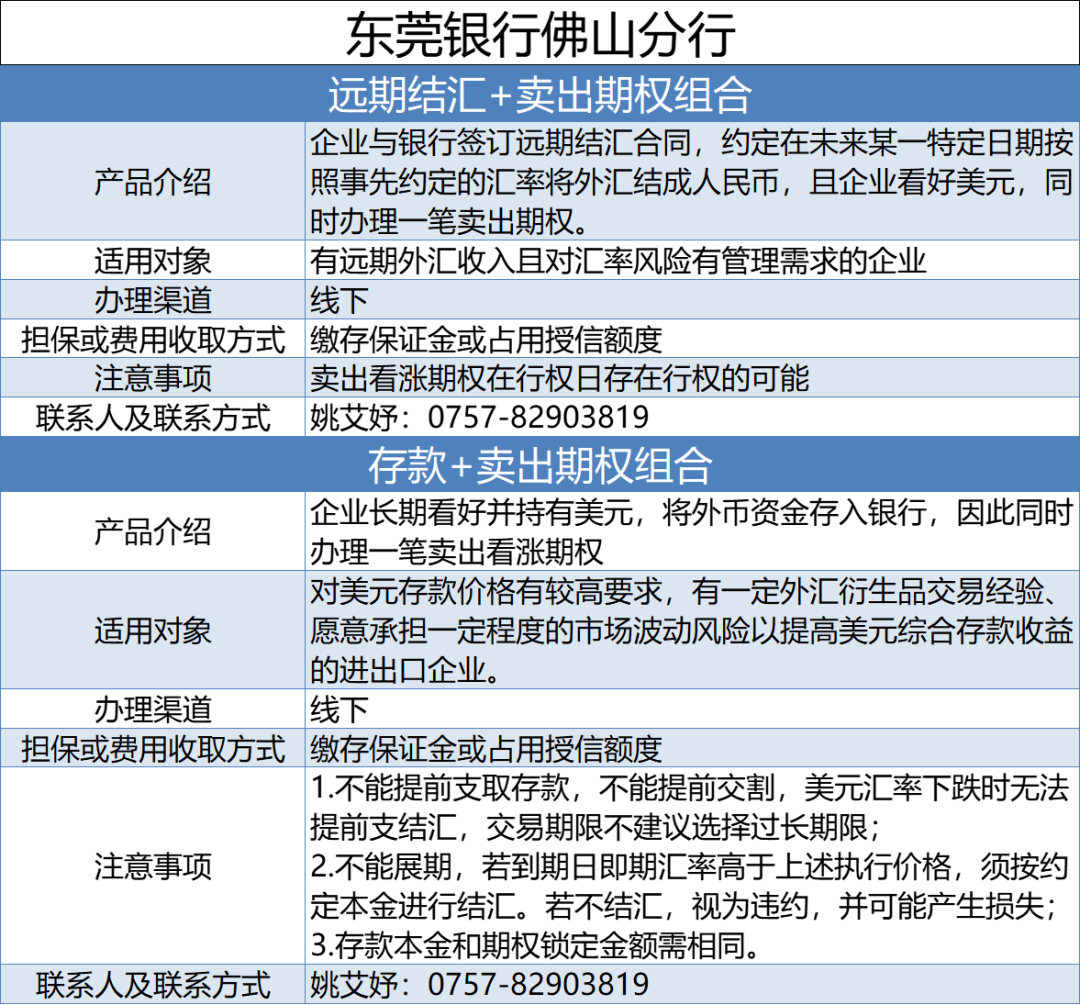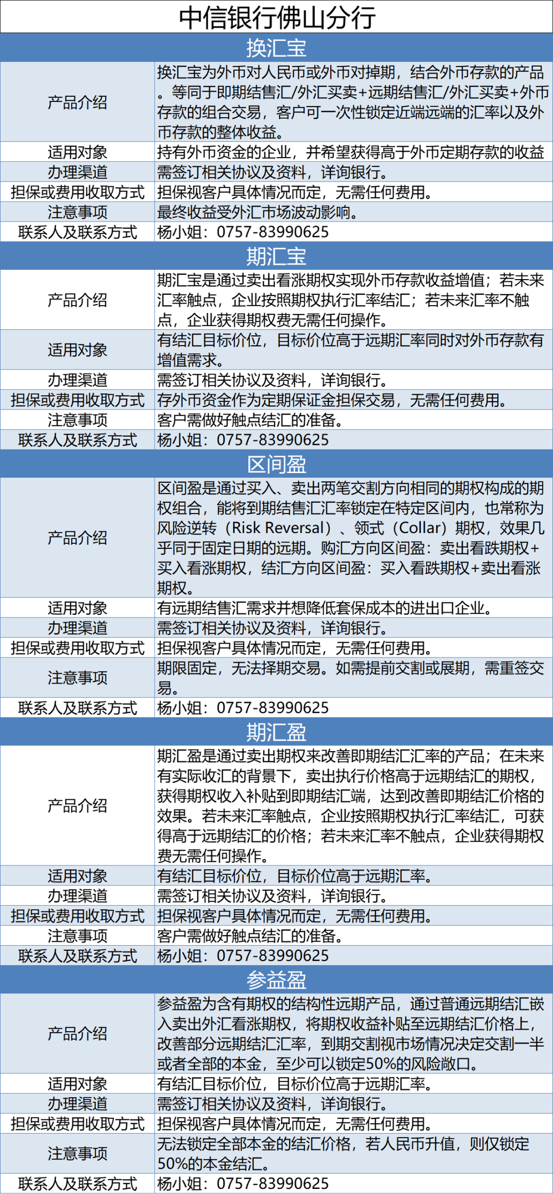 为贯彻落实党中央、国务院稳外贸工作决策部署,进一步加大对各类外贸主体的金融支持,优化融资、结算、外汇等金融服务,中国人民银行佛山市分行、国家外汇管理局佛山市分局积极引导辖内银行业金融机构创新服务产品,整理形成融资、结算、外汇等系列金融支持稳外贸产品和服务汇编,现予发布第二期——汇率避险产品,有汇率风险管理需求的市场经营主体可向相关金融机构咨询办理。