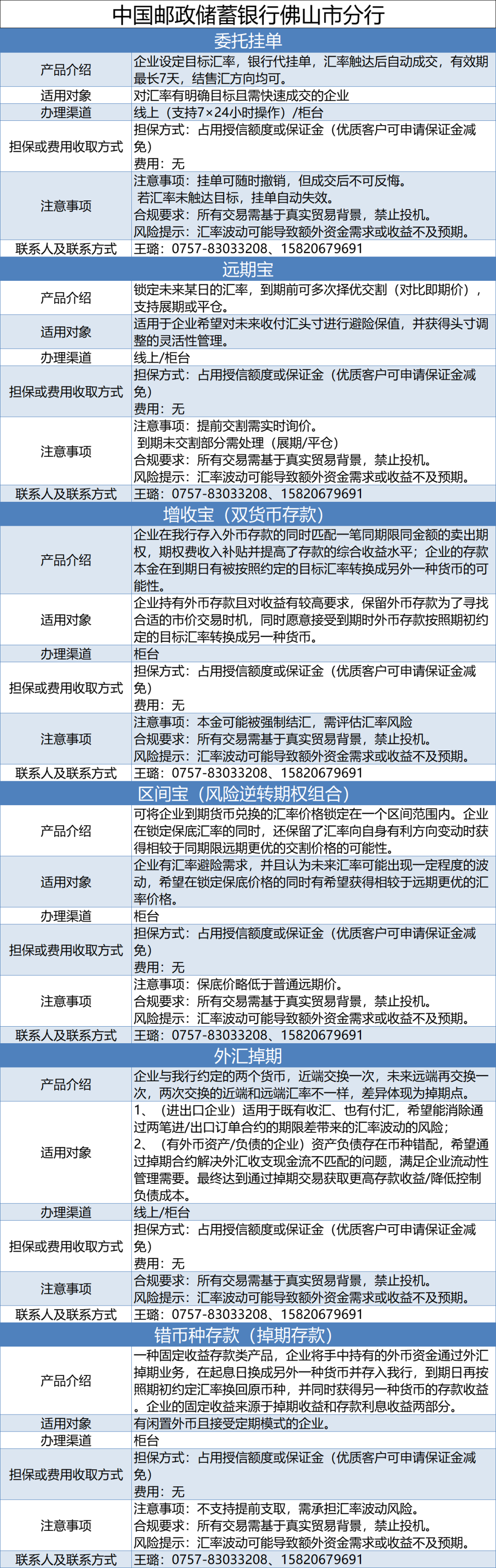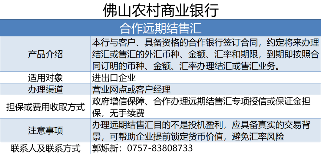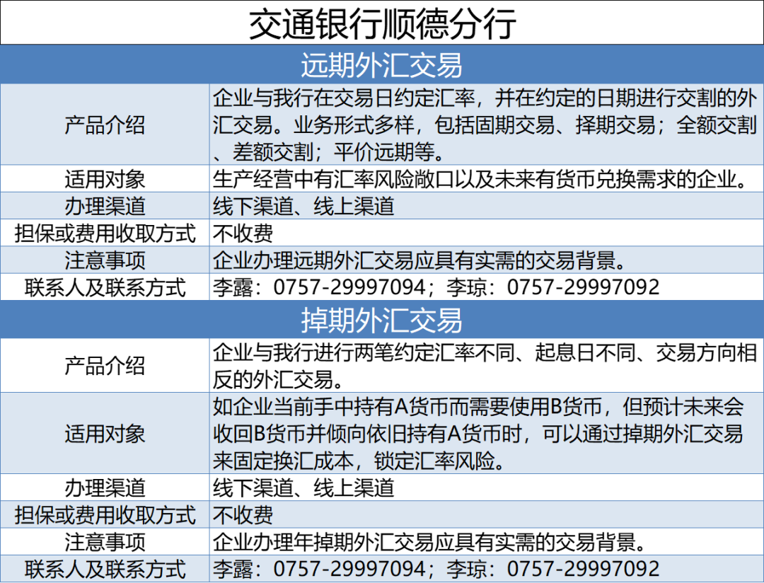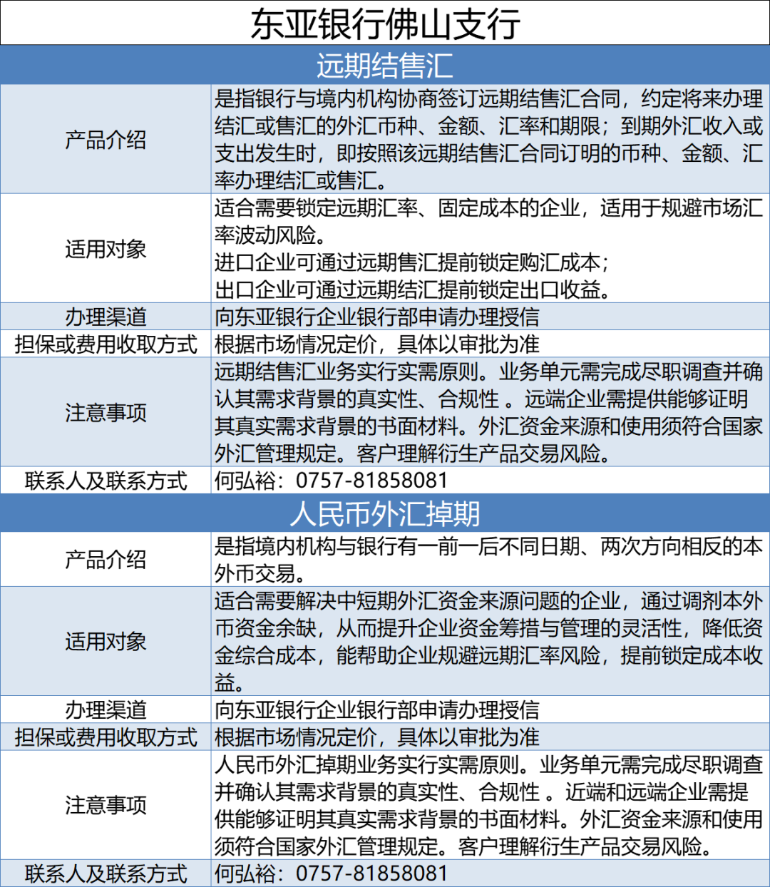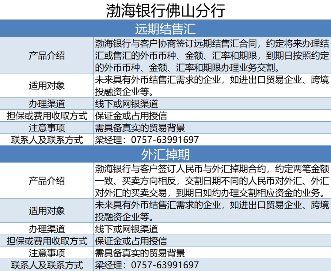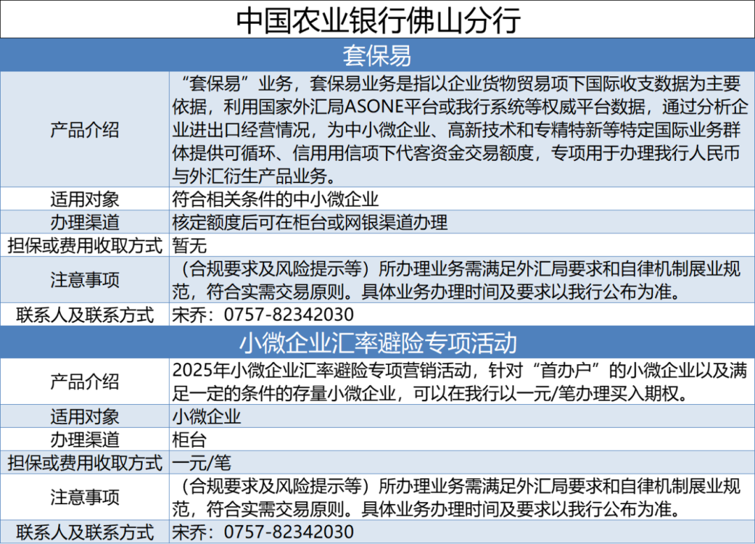 为贯彻落实党中央、国务院稳外贸工作决策部署,进一步加大对各类外贸主体的金融支持,优化融资、结算、外汇等金融服务,中国人民银行佛山市分行、国家外汇管理局佛山市分局积极引导辖内银行业金融机构创新服务产品,整理形成融资、结算、外汇等系列金融支持稳外贸产品和服务汇编,现予发布第二期——汇率避险产品,有汇率风险管理需求的市场经营主体可向相关金融机构咨询办理。