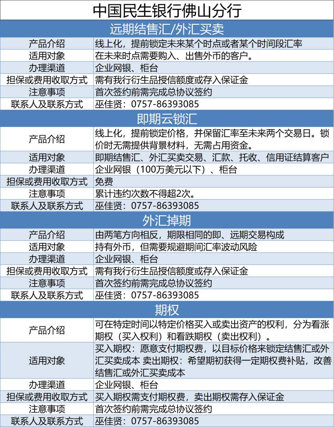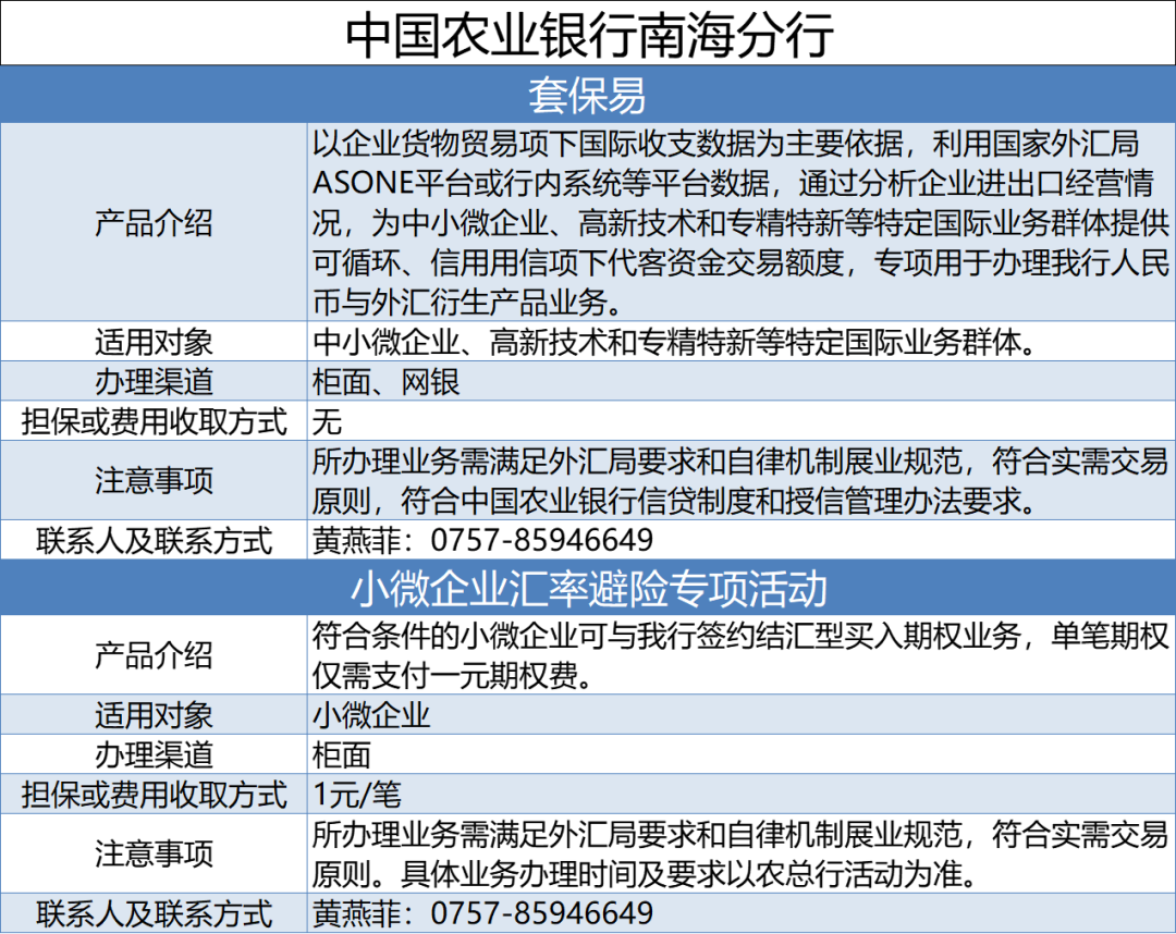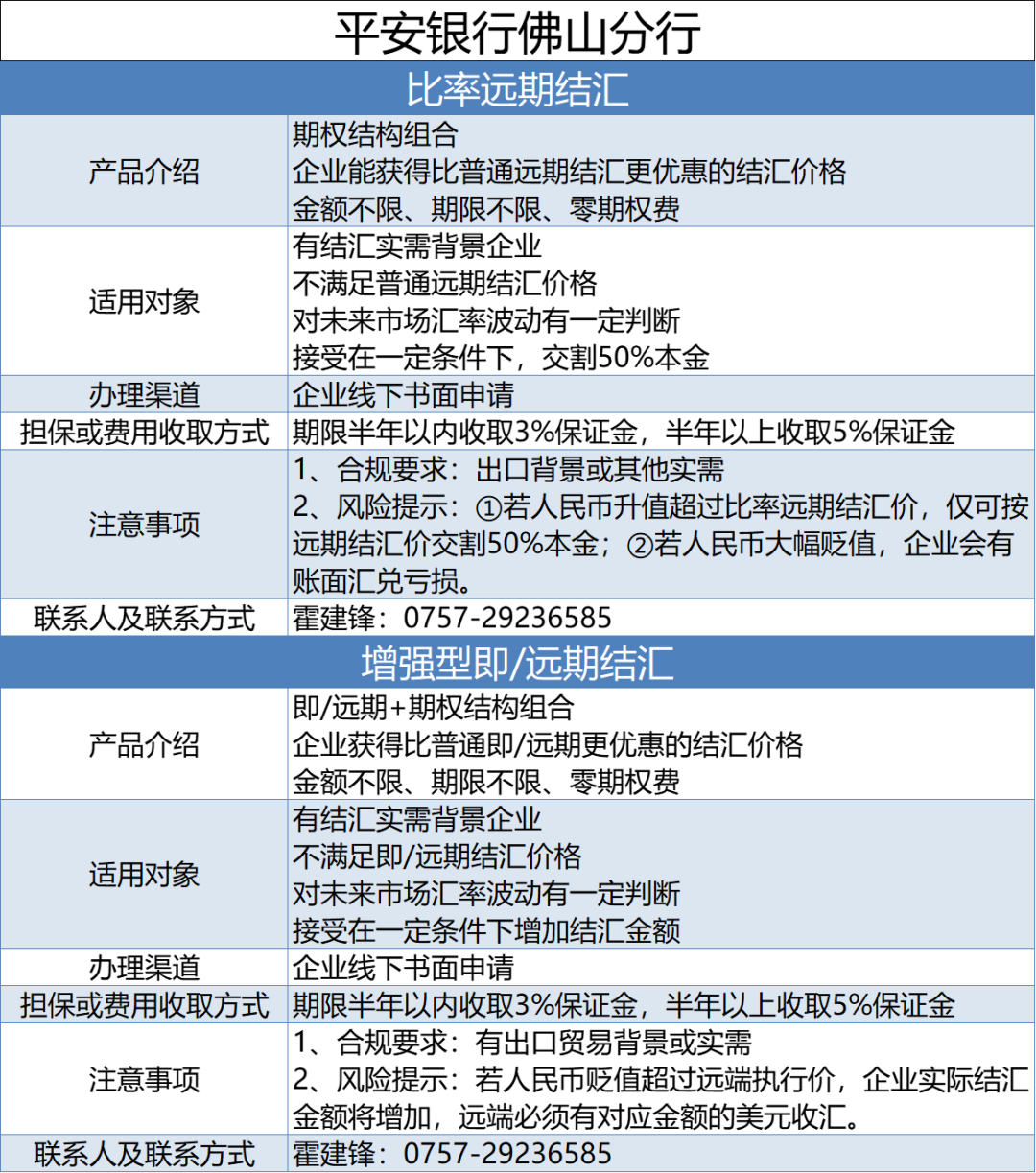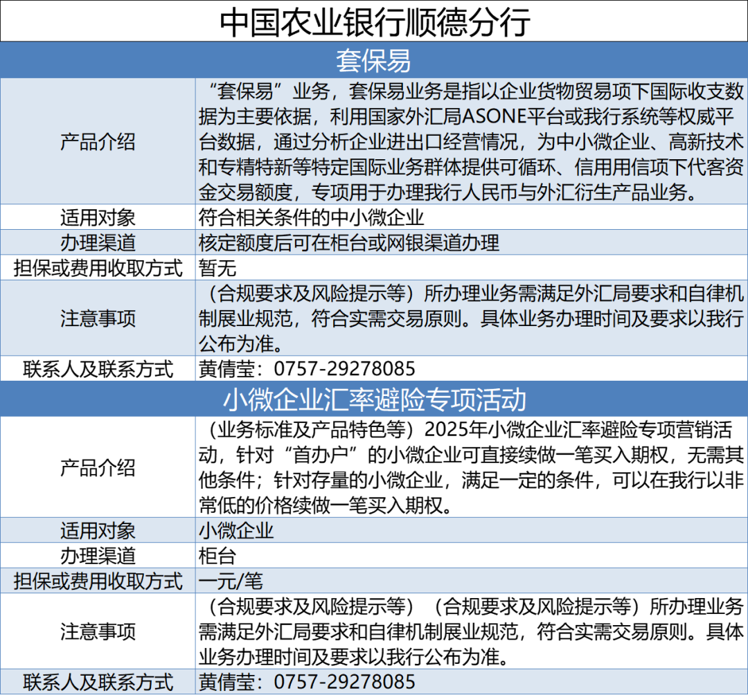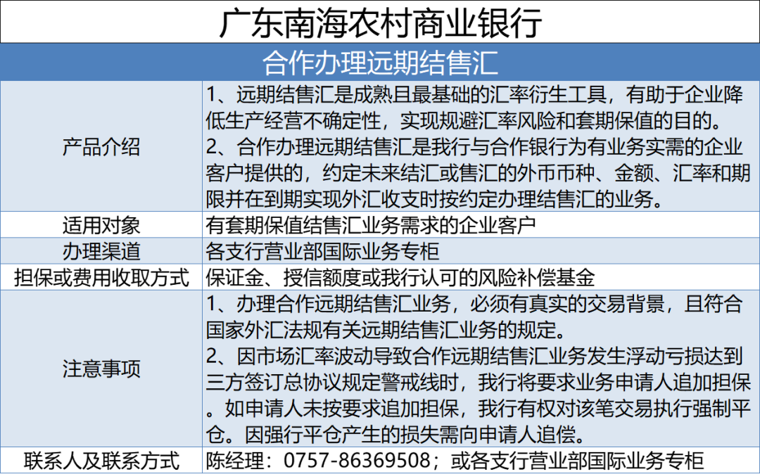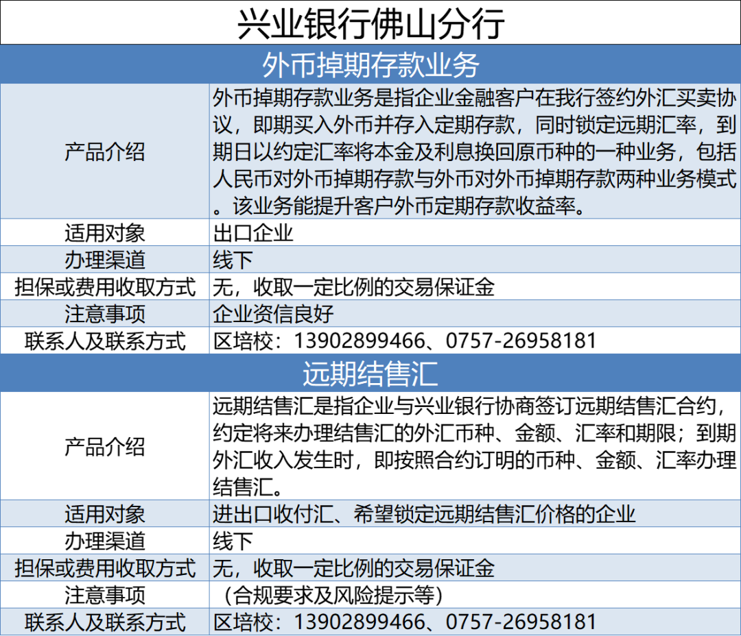 为贯彻落实党中央、国务院稳外贸工作决策部署,进一步加大对各类外贸主体的金融支持,优化融资、结算、外汇等金融服务,中国人民银行佛山市分行、国家外汇管理局佛山市分局积极引导辖内银行业金融机构创新服务产品,整理形成融资、结算、外汇等系列金融支持稳外贸产品和服务汇编,现予发布第二期——汇率避险产品,有汇率风险管理需求的市场经营主体可向相关金融机构咨询办理。