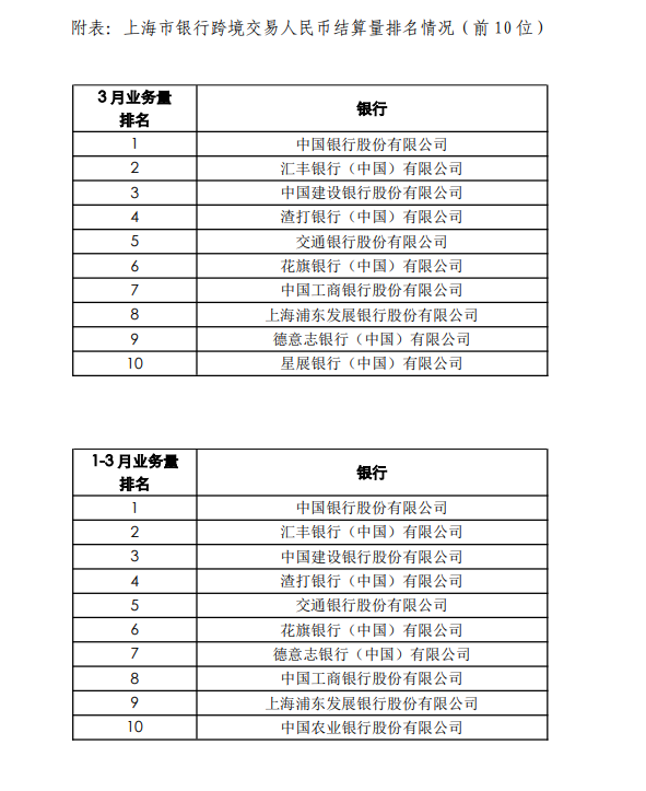 4月22日,人民银行上海总部发布3月份上海市银行跨境人民币业务结算量,截至3月末,上海市辖内共有100家银行报送跨境人民币结算业务信息,3月结算量29143亿元,1~3月累计结算量83333亿元。
