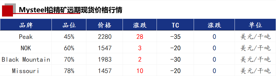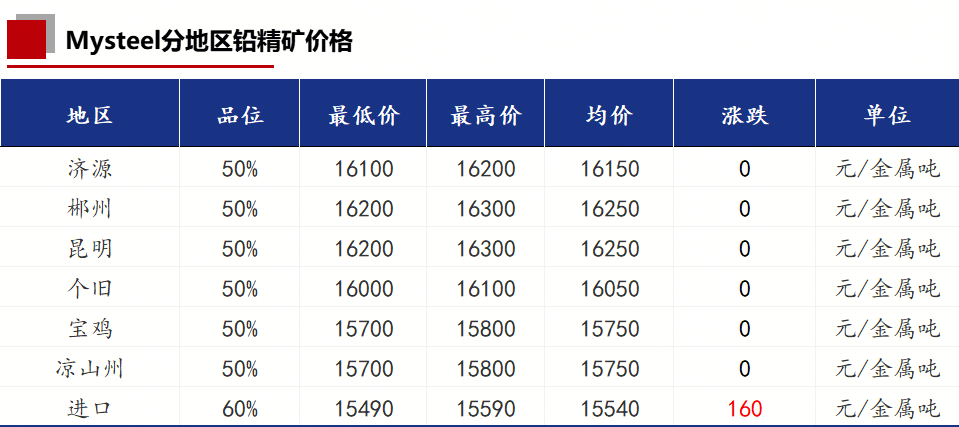 今日受铅价的影响,铅精矿价格较上一交易日持平。国内铅精矿加工费各地区均未调整,和上一交易日持平。进口铅精矿TC市场主流报价-20美元/干吨上下,今日暂无波动。