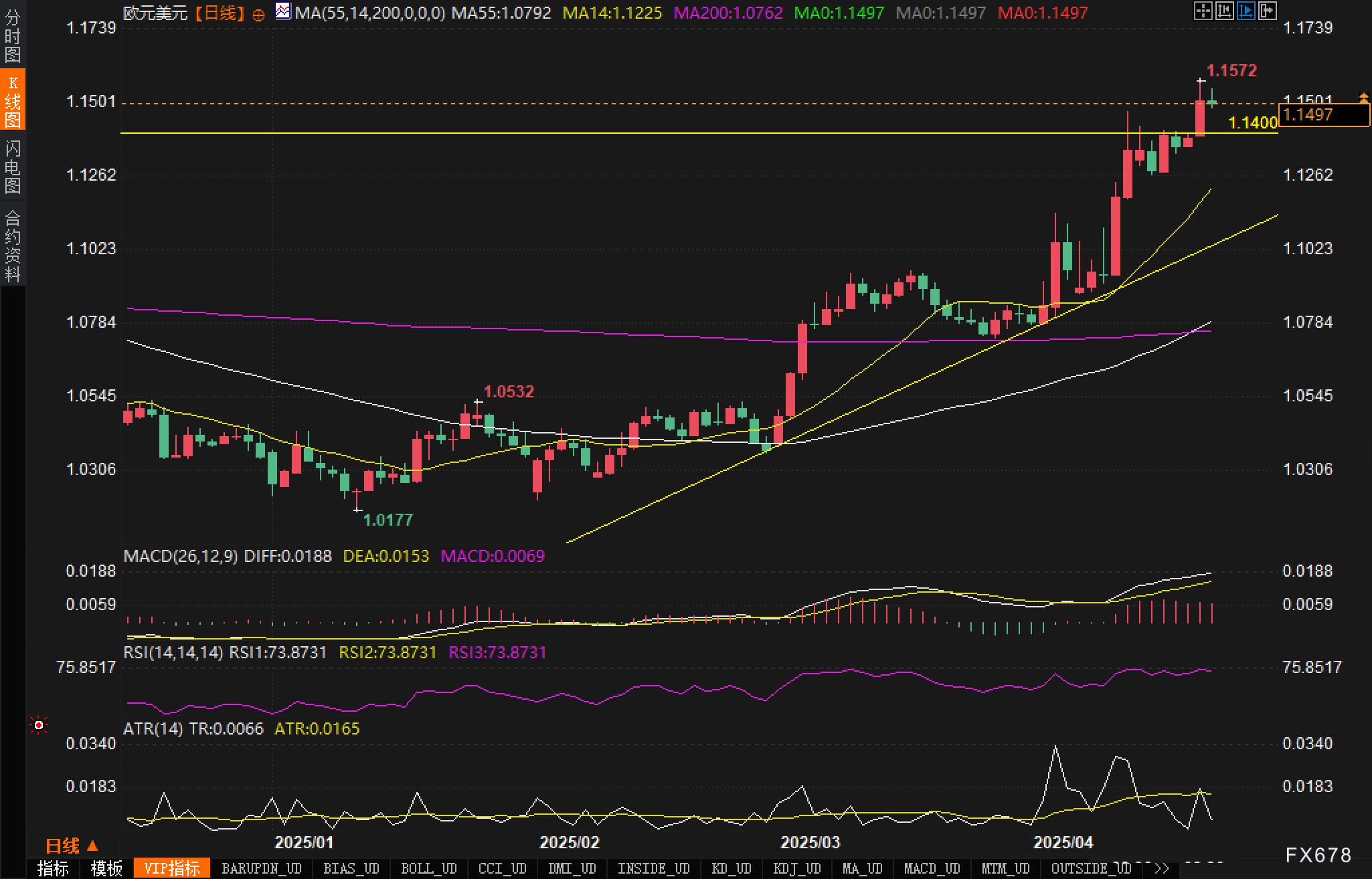 从日线图表分析,欧元/美元展现出更为明显的上升趋势特征。自低点1.0177以来,汇价已形成清晰的上升通道。RSI指标高达73.8731,已进入超买区域,这可能预示短期内需要一定的调整。MACD柱状图显示正向动能依然强劲,虽有小幅减弱迹象,但整体仍支持上行趋势延续。日线图上,汇价站稳1.1400支撑位,而上方1.1572为短期阻力。
