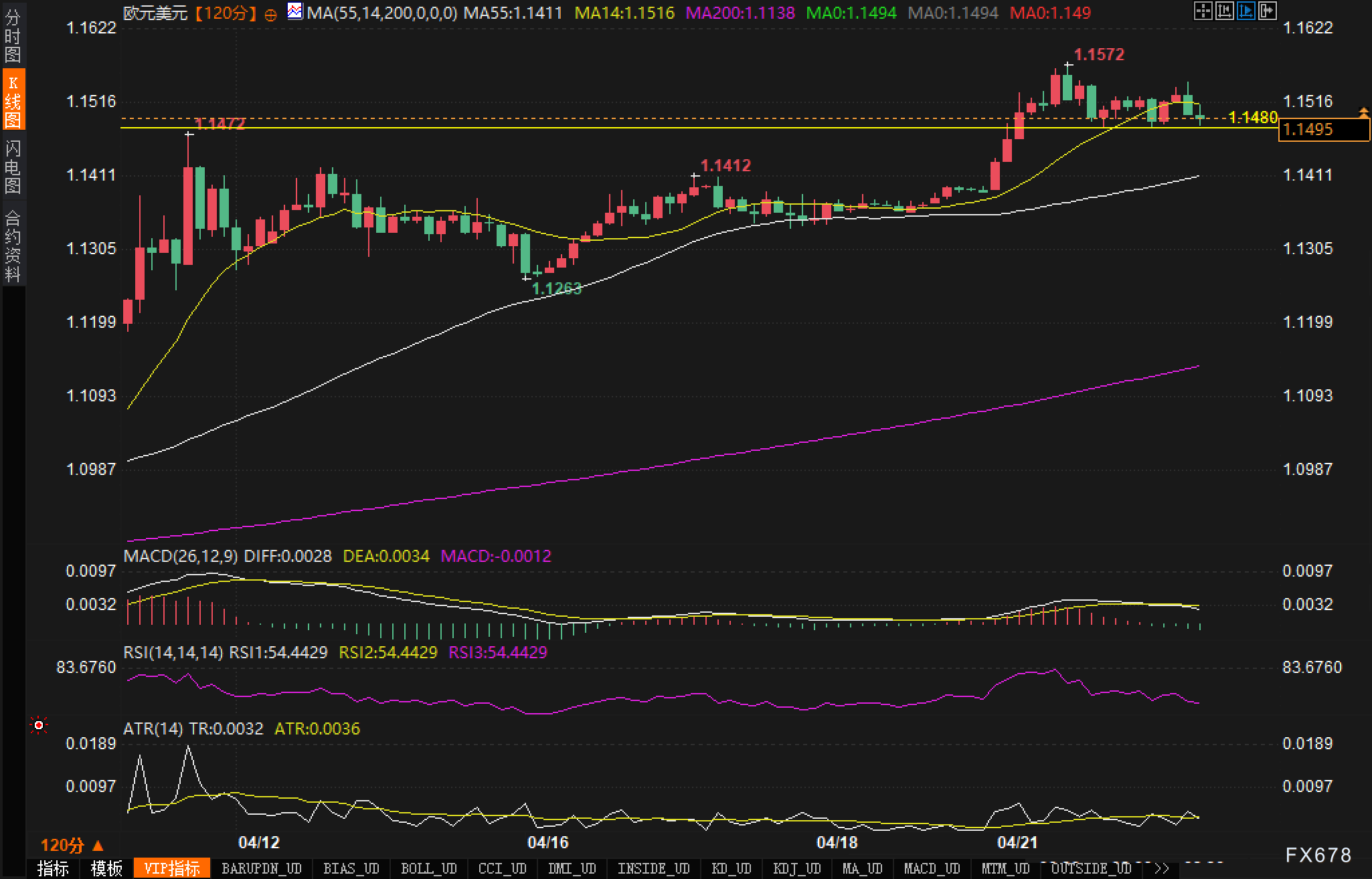 从120分钟图表来看,欧元/美元目前交易在1.15附近,远高于中期上升趋势线和一些移动平均线,显示出强劲的上升动能。MACD指标在零轴上方运行,RSI指标读数为54.4429,表明汇价仍处于上升通道中。当前,汇价正在测试1.1480水平的支撑,而上方阻力位于前期高点1.1572附近。值得注意的是,RSI尚未达到超买区域,这为进一步上涨留出了空间。